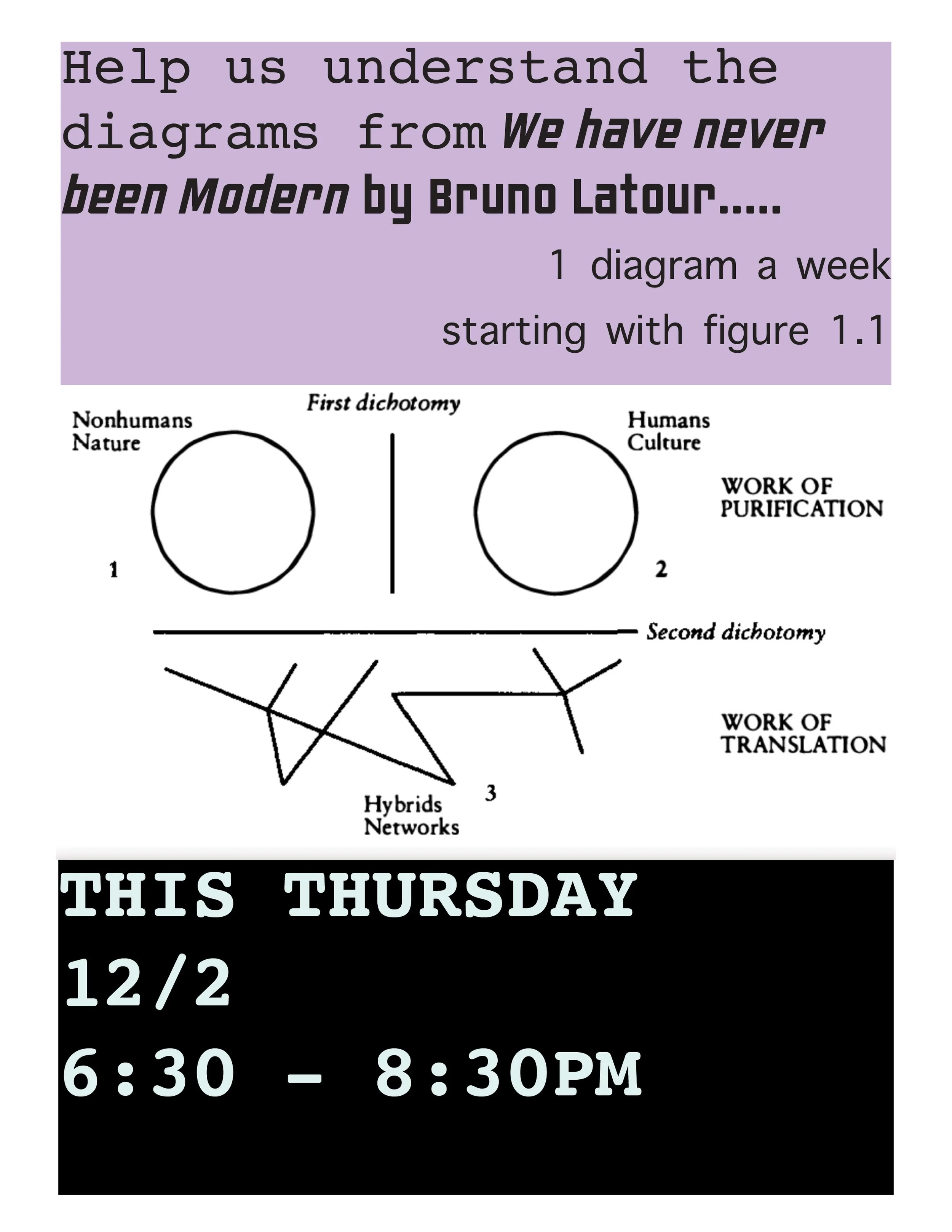 The first leg of the Trans-Media Relay launches from our current exhibition, the GalleryGalleryINC End of Year In-House Art Project: Help us understand We Have Never Been Modern by Bruno Latour, featuring the diagrams from his book ‘We Have Never Been Modern’ (1991), and takes form as Object Lore by KLATSCH Improv Ensemble this Thursday the 19th of February from 6 pm - 12 am. In this 6-hour durational performance, from which you can come and go as you wish, musicians will respond to the diagrams, gallery space and audience conversations, exploring the mediation between objects, spaces, and bodies.