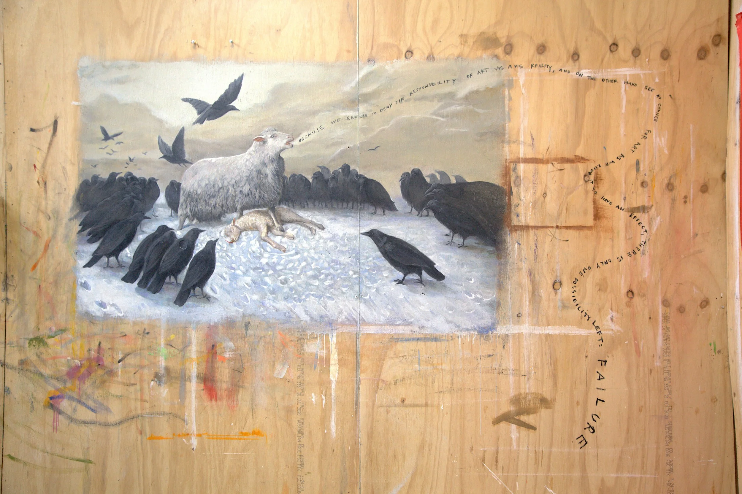 Unliked and terminally depressed, the great critic and writer Michael Denholm [I think] sees the realm of art as an alternative to the realm of life, as do I. The thing is that writers are like artists; some are taken seriously and some aren’t. The latter find them[our]selves in a trap of resentment. If the etymology of resentment comes from the French “ressentir” – the intensive prefix ‘re-‘ and the Latin ‘sentire’ to feel – then a resentment is a re-feeling or rumination. The English word has become synonymous with anger, spite, and holding a grudge. The works in this show rework and recontextualise hermetic and elitist tropes of painting’s history to a dual effect: they look stupid to experts and snobby to the uninitiated. Really, it’s the result of a crummy education. There are images, colour, materiality. Then there are silly titles. John C. Welchman calls titles of artworks ‘invisible colours’ that fetter a work’s visuality, even if it is ‘untitled’. All of the works in this show are blockades that bespeak the sense of futility that they try to break out of. A failure to express the personal is still an expression.